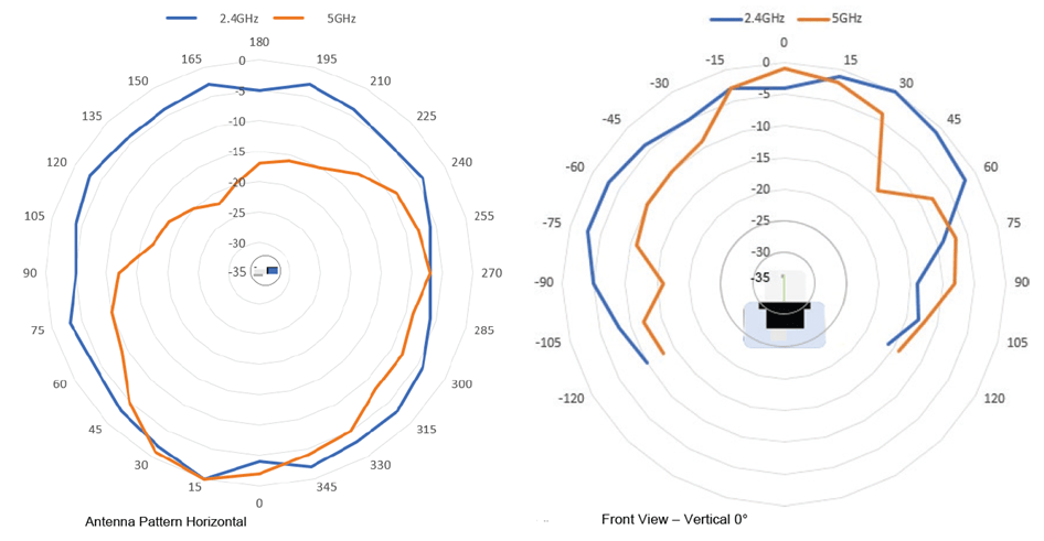 The design of these small radios lets you install them on any surface of the box you are placing them in. Top, side, front or bottom of a panel box are all viable locations for mounting. However, you need to be aware of the limitations. Let’s take a look at the antenna radiation patterns in both 2.4 & 5GHz.