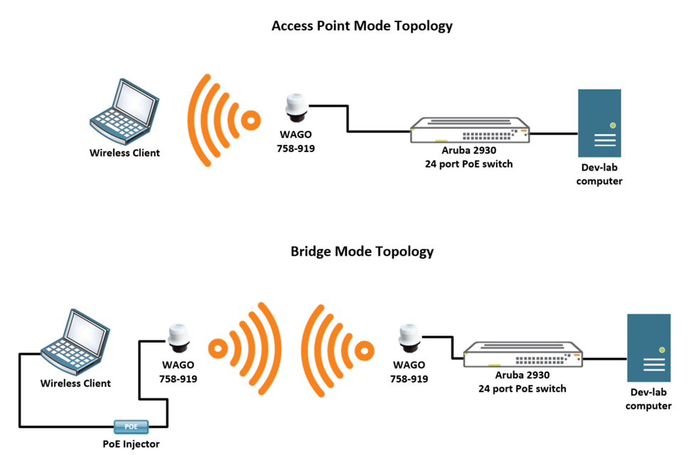 For testing purposes, refer to the bridging topology pictured above with the understanding that one WAGO device was in Bluetooth Access Point mode and the other was in Bluetooth Client mode. Additionally, the disclaimer previously stated holds true for this testing as well.