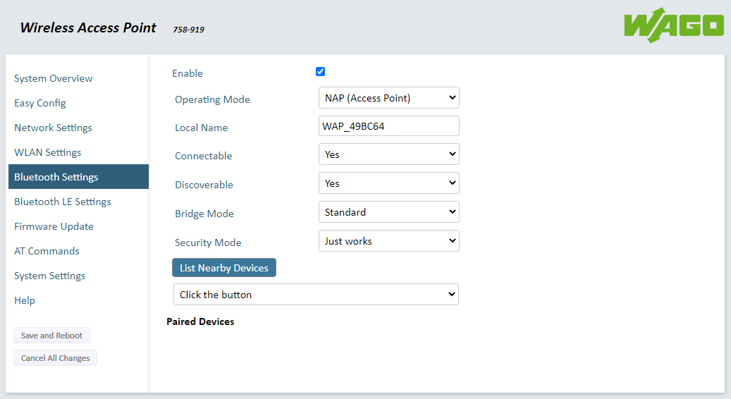 In Bluetooth and Bluetooth LE (BLE) states the only operational mode allowed is essentially bridging in where the radio can be either a Bluetooth Client or a Bluetooth Access Point. In AP mode it is capable of handling up to seven Bluetooth clients in a star type topology. The “gotcha” on this is that they can only connect to other WAGO 758-919 devices due to how they handle the protocol internally.