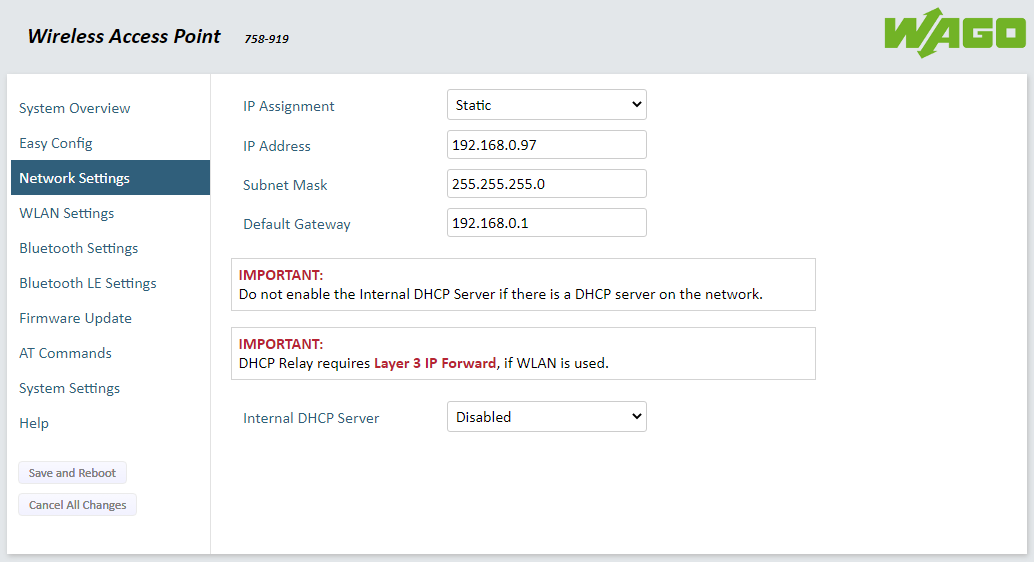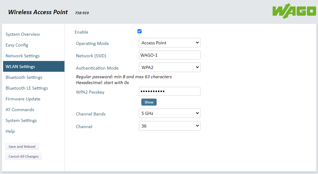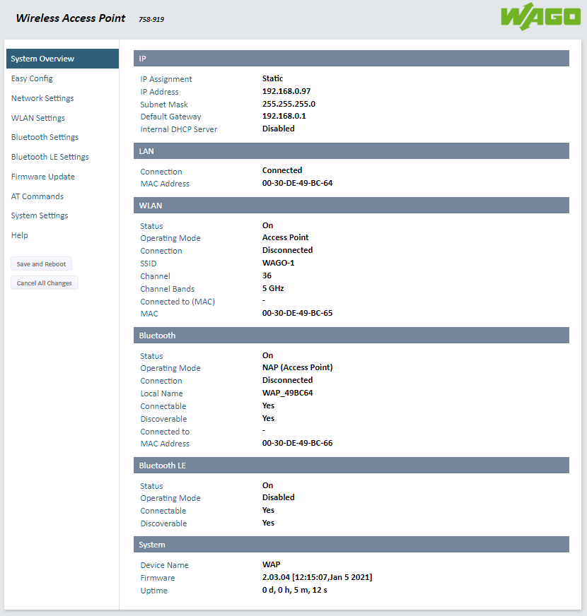 The web interface of the WAGO 758-919 series is straightforward and intuitive. WAGO did a good job of keeping it clean and simple to navigate and use. Having never seen or handled one of these specific devices before, I had the first access point up and running on my development network in about ten minutes. Click the links below to view some screen grabs of the user interface.